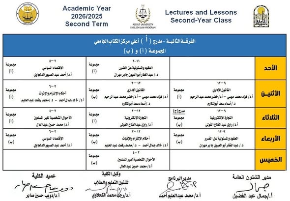 جدول محاضرات الفرقة الثانية حقوق لغة انجليزية الفصل الدراسي الثاني 2026