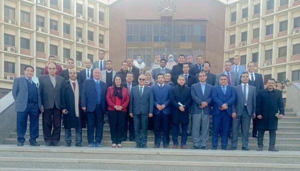 A group of memorial photos in the presence of Prof. Dr. Tarek El-Gamal, President of the University, and Prof. Dr. Maha Ghanem, Vice President for Environmental Affairs and Community Service, and in the presence of the Vice-Deans and a group of faculty members and their assistants.