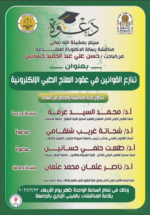 مناقشة رسالة الدكتوراه المقدمة من الباحث / حسن علي عبدالحميد حسانين بعنوان " تنازع القوانين في عقود العلاج الطبي الإلكترونية