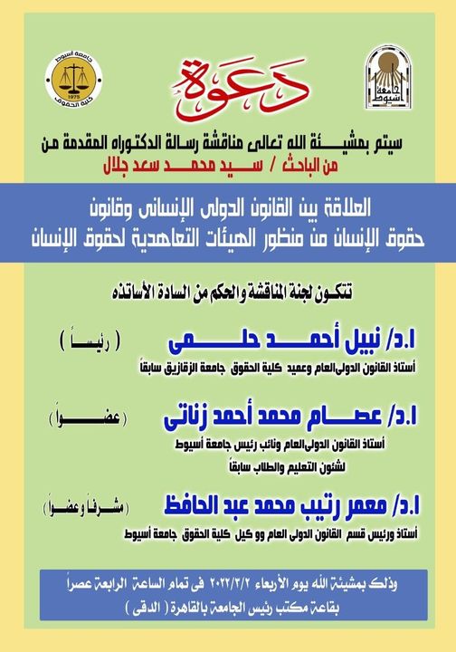 مناقشة رسالة الدكتوراه المقدمة من الباحث / سيد محمد سعد جلال بعنوان " العلاقة بين القانون الدولي الإنساني وقانون حقوق الإنسان من منظور الهيئات التعاهدية لحقوق الإنسان "