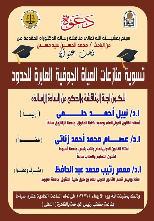 Discussion of the PhD thesis submitted by the researcher / Muhammad Al-Hussein Sayed Hussain, entitled "Settlement of Transboundary Groundwater Disputes"