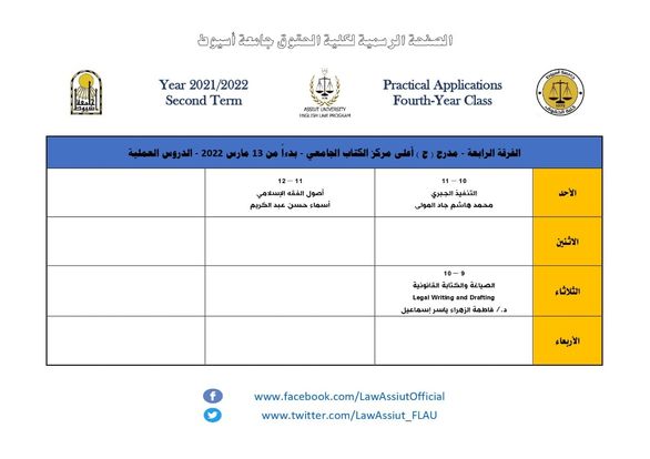 The Faculty of Law, Assiut University, has the honor to invite its students from the English Language Division in particular, and all interested students from the faculty and the university in general, to participate in the first event of the mock trial in English. Those who wish to participate in this activity must fill out the attached form in the link below.