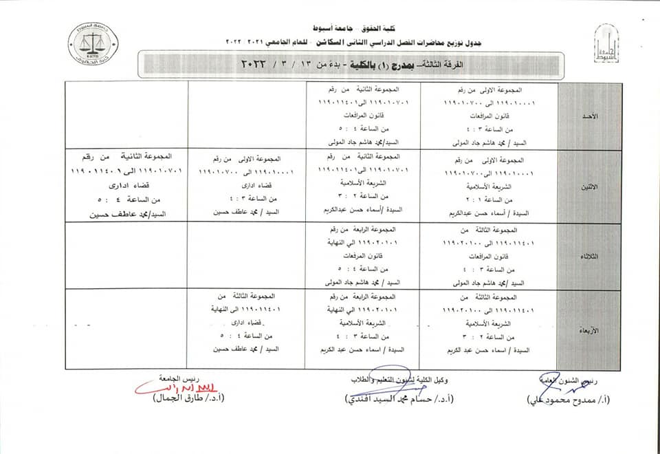 جدول توزيع محاضرات سكاشن حقوق عربي الفرقة الثالثة الفصل الدراسي الثاني