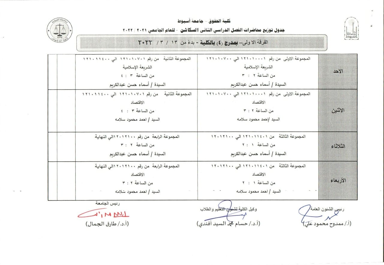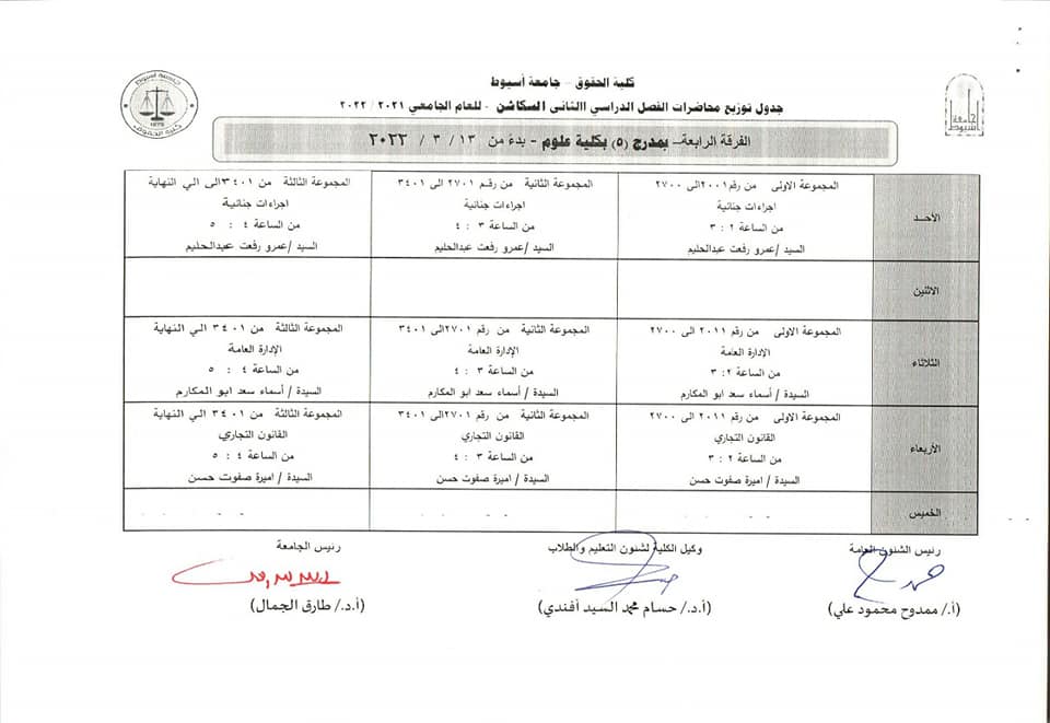 جدول توزيع محاضرات سكاشن حقوق عربي الفرقة الرابعة الفصل الدراسي الثاني