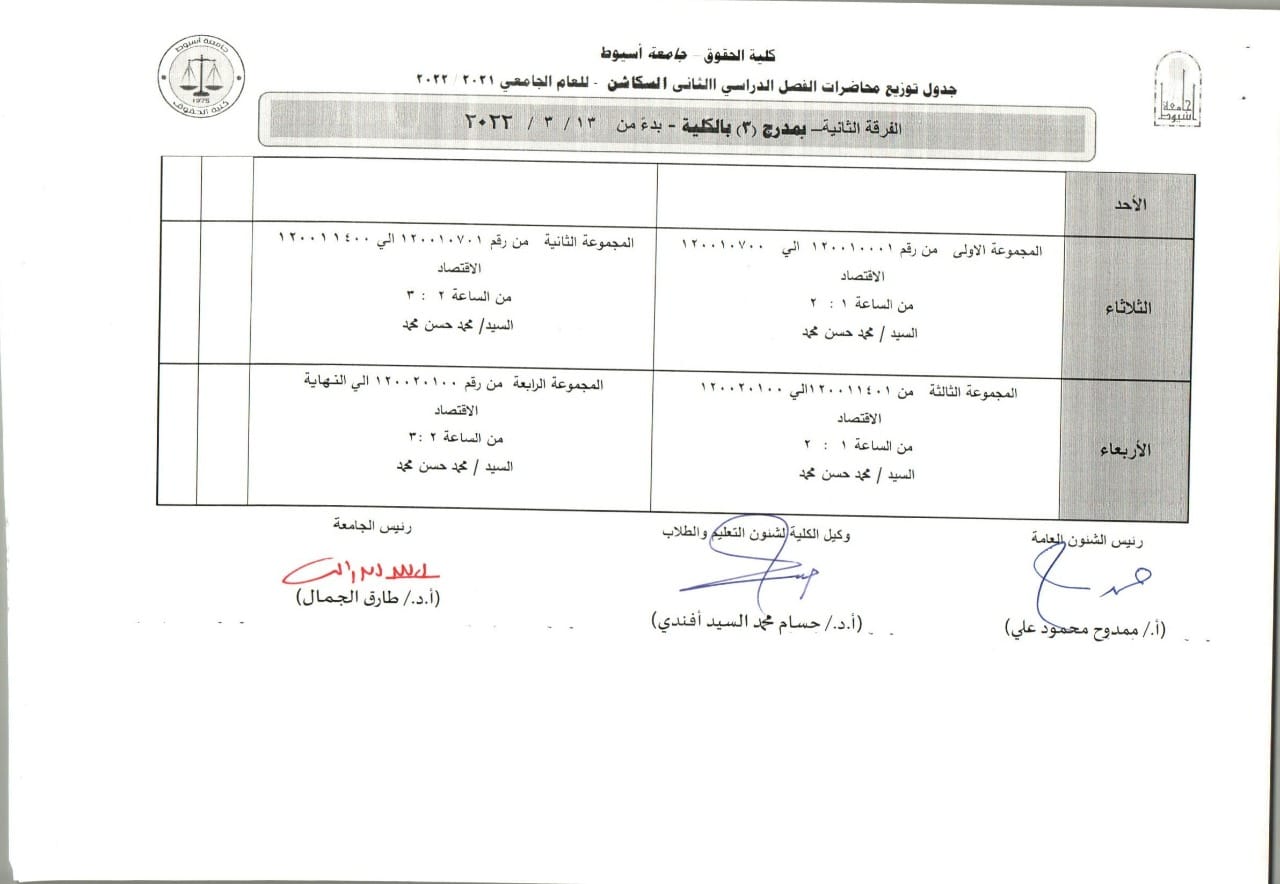 جدول توزيع محاضرات سكاشن حقوق عربي الفرقة الثانية الفصل الدراسي الثاني