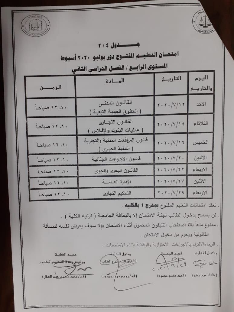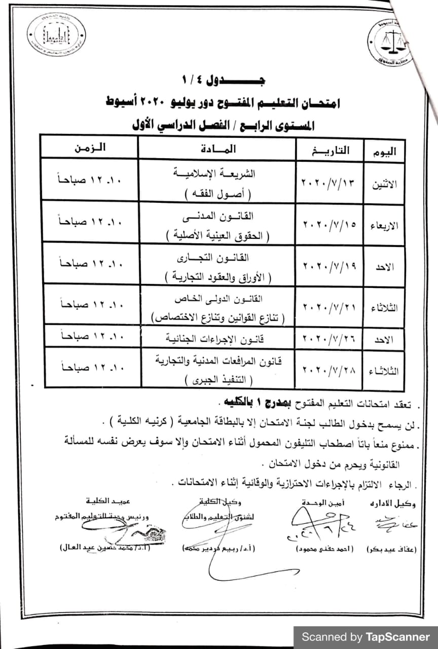 جدول النعليم المفتوح - المستوى الرابع - الفصل الدراسى الاول 2020
