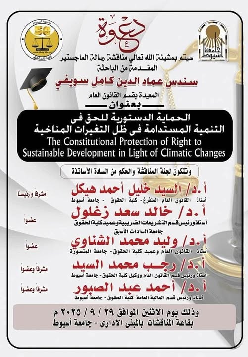 Discussion of the master's thesis submitted by researcher / Sondos Imad El-Din Kamel, a teaching assistant in the Department of Public Law, entitled "Constitutional Protection of the Right to Sustainable Development in Light of Climate Change"