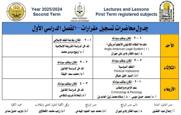 First semester 2025 course registration lecture schedule 7 April 2025 Faculty Of Law Assiut University كلية الحقوق جامعة أسيوط
