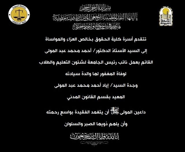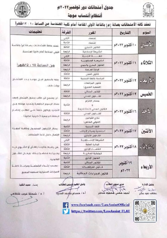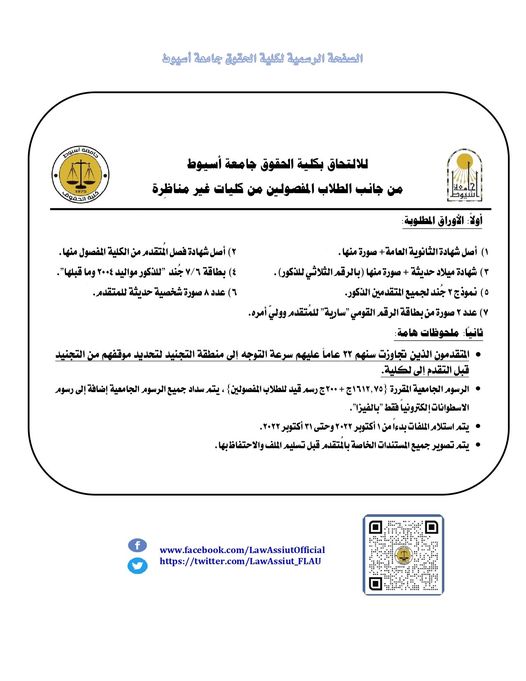 To join the Faculty of Law, Assiut University, by students who were dismissed from non-equivalent faculties Read more about To join the Faculty of Law, Assiut University, by students who were dismissed from non-equivalent faculties 27 September 2022