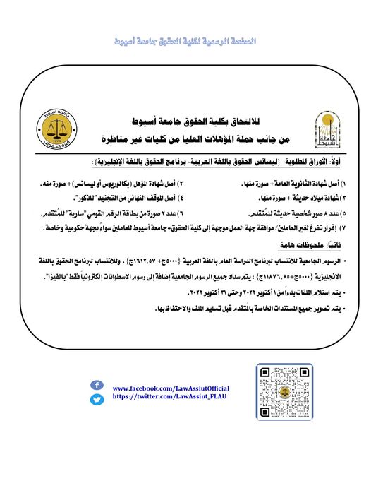 To enroll in the Faculty of Law, Assiut University, by holders of higher qualifications from non-equivalent faculties Read more about To enroll in the Faculty of Law, Assiut University, by holders of higher qualifications from non-equivalent faculties 27 September 2022