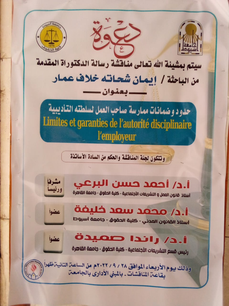 Discussion of the doctoral thesis of researcher / Eman Shehata Khalaf Ammar, entitled "Limitations and guarantees for the employer's exercise of his disciplinary authority" Read more about Discussion of the doctoral thesis of researcher / Eman Shehata Khalaf Ammar, entitled "Limitations and guarantees for the employer's exercise of his disciplinary authority" 27 September 2022
