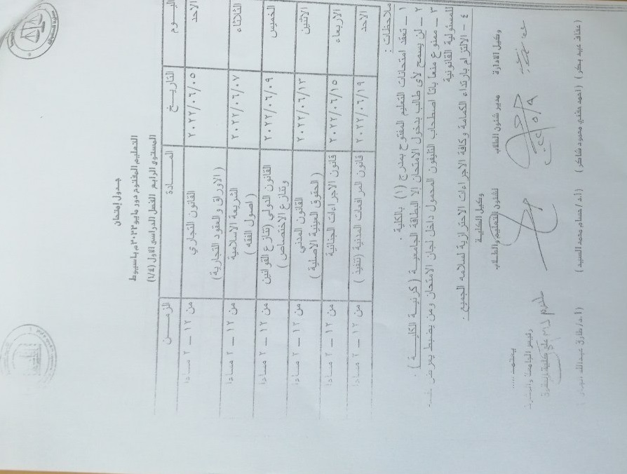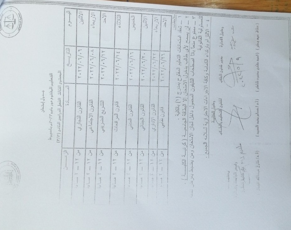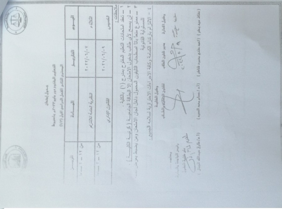 The open education exams are held in amphitheater (1) in the college No student will be allowed to enter the exam without a university card (college card). It is strictly forbidden to take a mobile phone inside the examination committees, and whoever is caught exposes himself to legal responsibility Commitment to wearing a mask and all precautionary measures for the safety of all