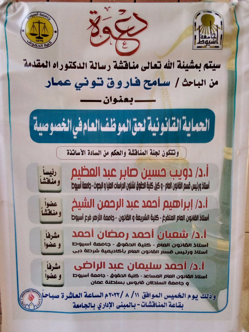 Discussion of the PhD thesis submitted by researcher / Sameh Farouk Tony Ammar entitled "Legal Protection of the Public Employee's Right to Privacy" Read more about Discussion of the PhD thesis submitted by researcher / Sameh Farouk Tony Ammar entitled "Legal Protection of the Public Employee's Right to Privacy" 10 August 2022