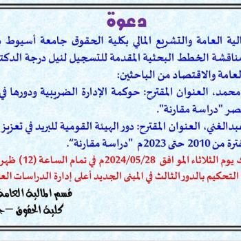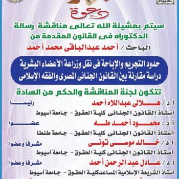 The Faculty of Law, Assiut University, on behalf of Prof. Dr. Duaib Hussein Saber, Dean of the Faculty, the Vice Deans, the faculty members, and all its affiliates, extends its sincere…