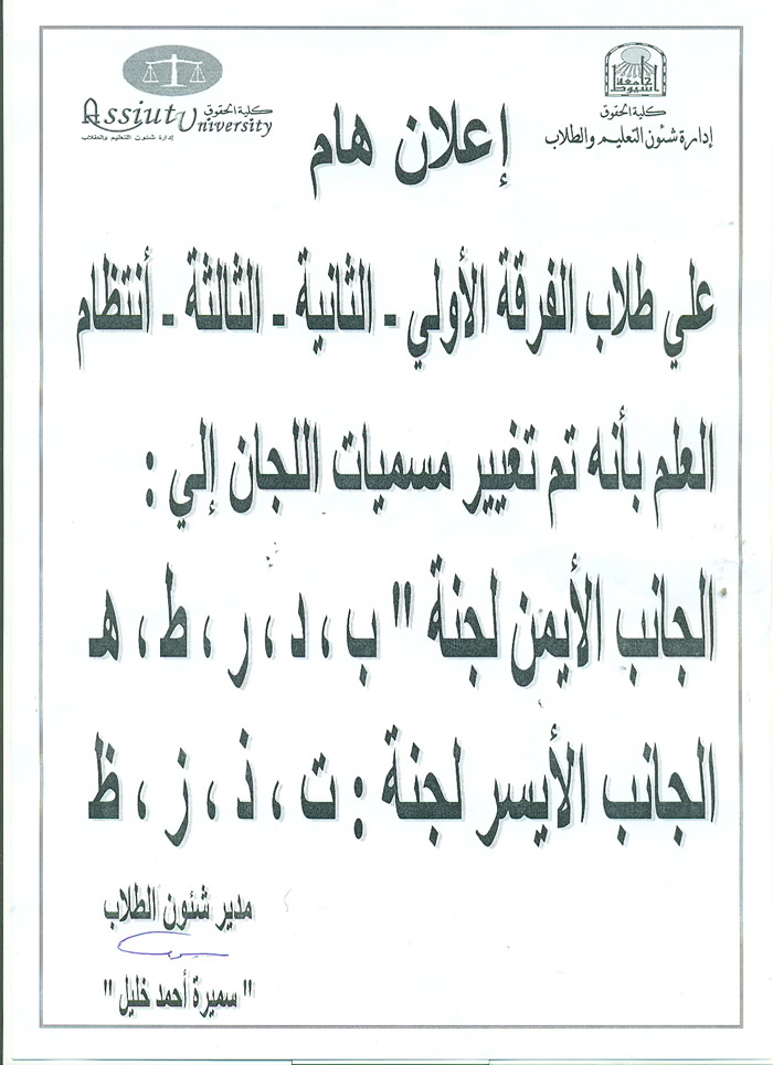 Important announcement for the students of the first second trimester Regularity of changing the names of the committees to the right side Committee B, D, R, T and E and the left side Committee T, Y, Z, Z