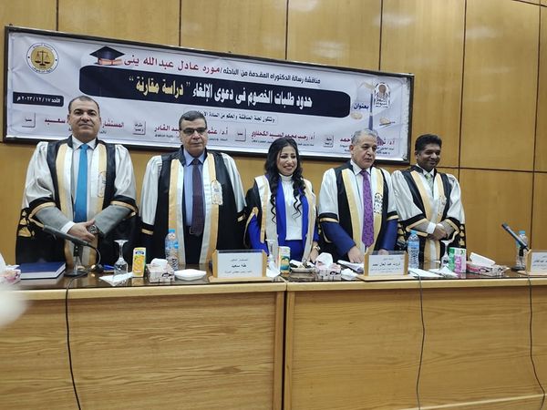 •Professor Dr. Rajab Muhammad Al-Sayed Al-Kahlawi Professor of public law Vice Dean of the Faculty of Law for Education and Student Affairs, Assiut University. •Professor Dr. Othman Abdel Qader Professor and Head of the Civil Procedure Law Department Consultant Dr. Taha Saeed Vice President of the State Council •The committee recommended granting the researcher a doctorate in law with a good grade. The college invites researchers to attend these scientific forums because they enrich them at the scientific level and expose them to different schools of jurisprudence by elite jurists in Egypt and the Arab world.