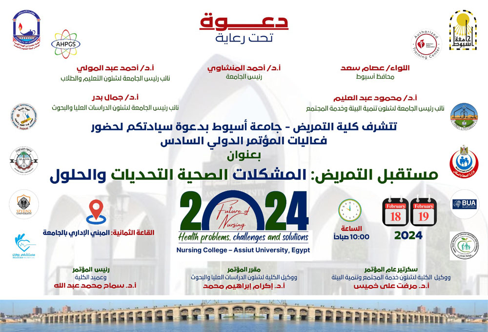 تحت رعاية الدكتور أحمد المنشاوي رئيس جامعة أسيوط، تنظم كلية التمريض، فعاليات مؤتمرها الدولي السادس، تحت عنوان: "مستقبل التمريض: المشكلات الصحية؛ التحديات، والحلول" ، والممتد خلال الفترة من ١٨ إلي ١٩ فبراير، بالقاعة الثمانية بالمبنى الإداري، وذلك بمشاركة كوكبة من الخبراء في مجال التمريض بالجامعات المصرية، والعربية، والأجنبية، إلي جانب لفيف من أساتذة الطب في التخصصات العلمية المختلفة.