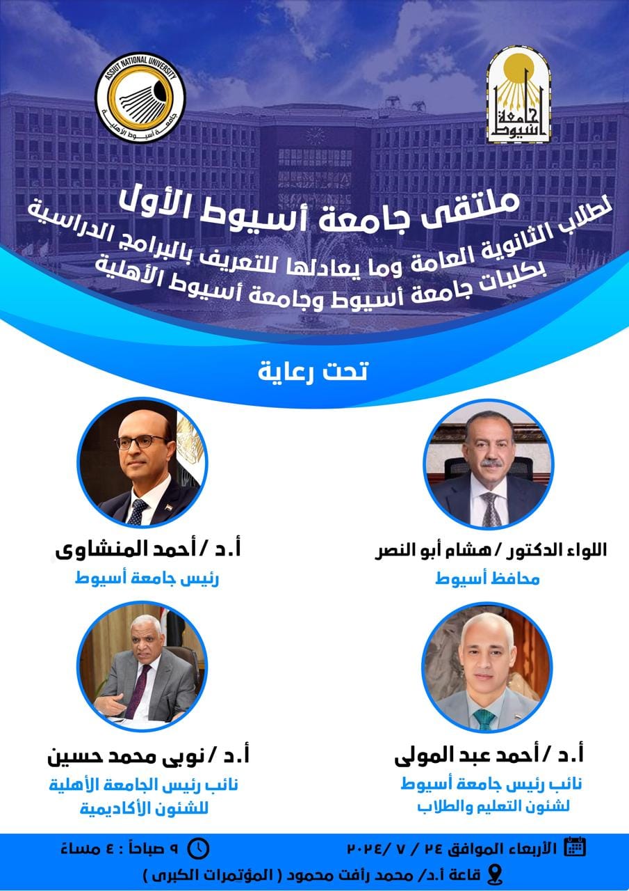 تحت رعاية الدكتور أحمد المنشاوي رئيس جامعة أسيوط؛ تشهد قاعة المؤتمرات الكبرى بجامعة أسيوط، فعاليات "ملتقى جامعة أسيوط الأول؛ لطلاب الثانوية العامة، وما يعادلها؛ بحضور اللواء دكتور هشام أبو النصر محافظ أسيوط، يوم الأربعاء الموافق ٢٤ من يوليو، في تمام الساعة التاسعة صباحاً؛ وذلك للتعريف بالبرامج الدراسية، بكليات جامعة أسيوط، وجامعة أسيوط الأهلية، تحت إشراف الدكتور أحمد عبد المولى نائب رئيس الجامعة لشئون التعليم والطلاب، والدكتور نوبي محمد حسن نائب رئيس الجامعة الأهلية للشئون الأكاديمية، والدكتور محمد جابر قاسم وكيل كلية التربية لشئون التعليم والطلاب، ومنسق الملتقى.