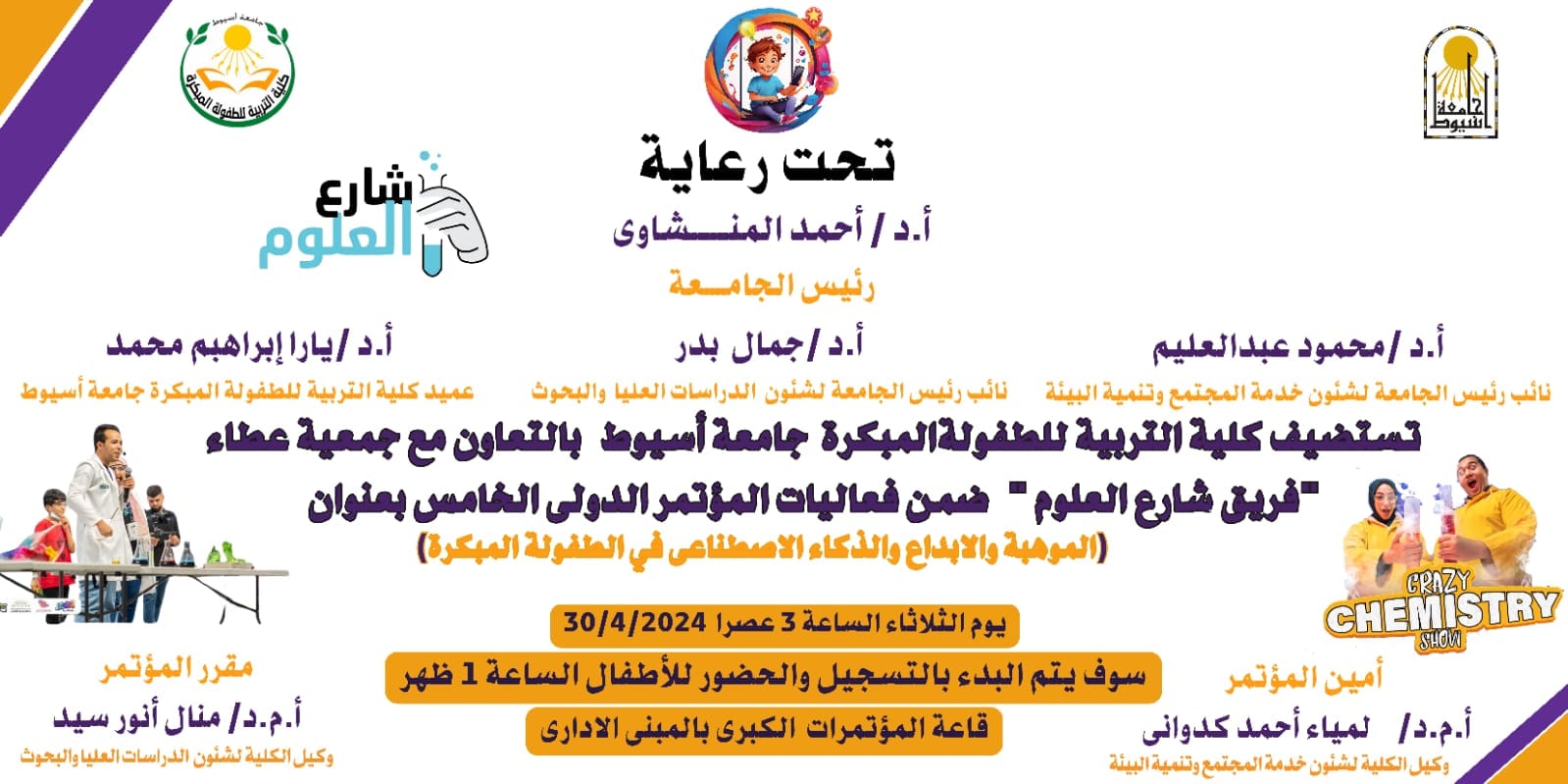 تنطلق فعاليات "شارع العلوم"، يوم الثلاثاء الموافق 30 من أبريل الجاري، تحت رعاية الدكتور أحمد المنشاوي رئيس جامعة أسيوط، والذي تنظمه كلية التربية للطفولة المبكرة، وبالتعاون مع جمعية عطاء بلا حدود، وذلك في إطار المؤتمر الدولي الخامس للكلية بعنوان: (الموهبة، والإبداع، والذكاء الاصطناعي في الطفولة المبكرة "رؤى بحثية، وطموحات مستقبلية"، تحت إشراف الدكتور محمود عبد العليم نائب رئيس الجامعة لشئون خدمة المجتمع وتنمية البيئة، والدكتور جمال بدر نائب رئيس الجامعة لشئون الدراسات العليا والبحوث، والدكتورة يارا إبراهيم عميد كلية التربية للطفولة المبكرة، بقاعة المؤتمرات الكبرى بالجامعة.