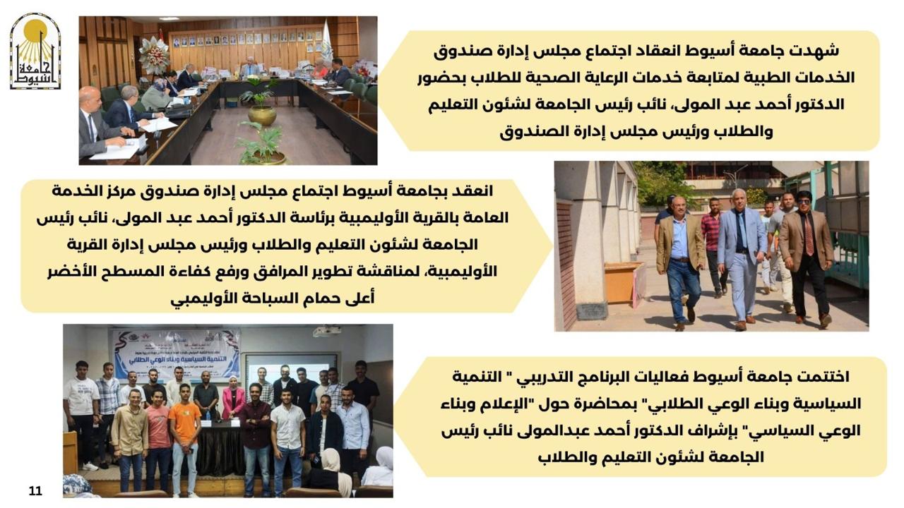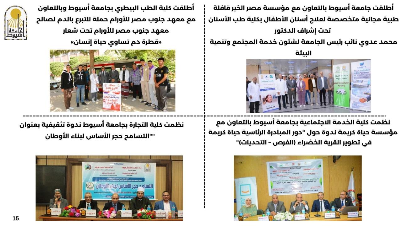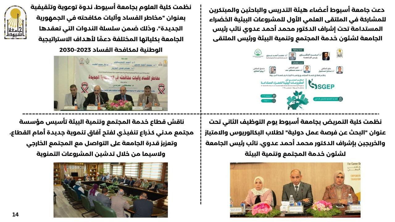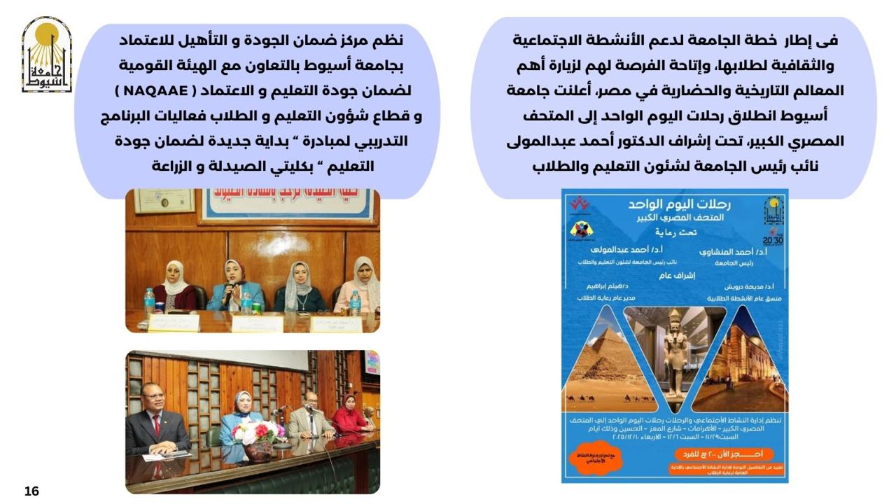 حيث شهدت جامعة أسيوط العديد من الفعاليات والأنشطة والتي عكست التزام الجامعة بالتميز الأكاديمي، والمشاركة الفعالة في قضايا المجتمع، وعززت مكانتها كمؤسسة تعليمية رائدة تسهم في تحقيق أهداف التنمية المستدامة ورؤية مصر 2030