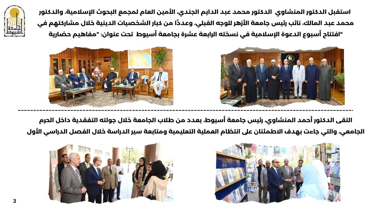 • كما واصلت جامعة أسيوط فعاليات الأسبوع الرابع عشر للدعوة الإسلامية في يومه الثالث حول "العلم قاطرة الحراك الحضاري"