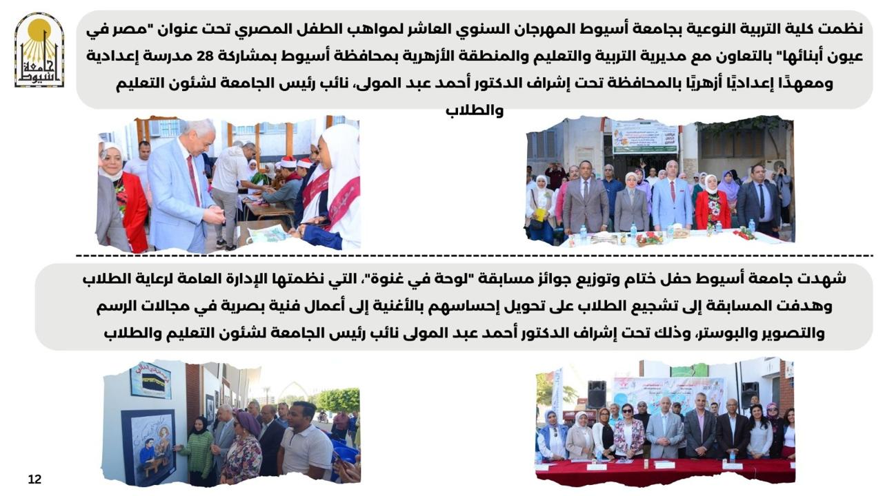 • نظمت كلية التربية النوعية بجامعة أسيوط المهرجان السنوي العاشر لمواهب الطفل المصري تحت عنوان "مصر في عيون أبنائها" بالتعاون مع مديرية التربية والتعليم والمنطقة الأزهرية بمحافظة أسيوط بمشاركة 28 مدرسة إعدادية ومعهدًا إعداديًا أزهريًا بالمحافظة تحت إشراف الدكتور أحمد عبد المولى، نائب رئيس الجامعة لشئون التعليم والطلاب.