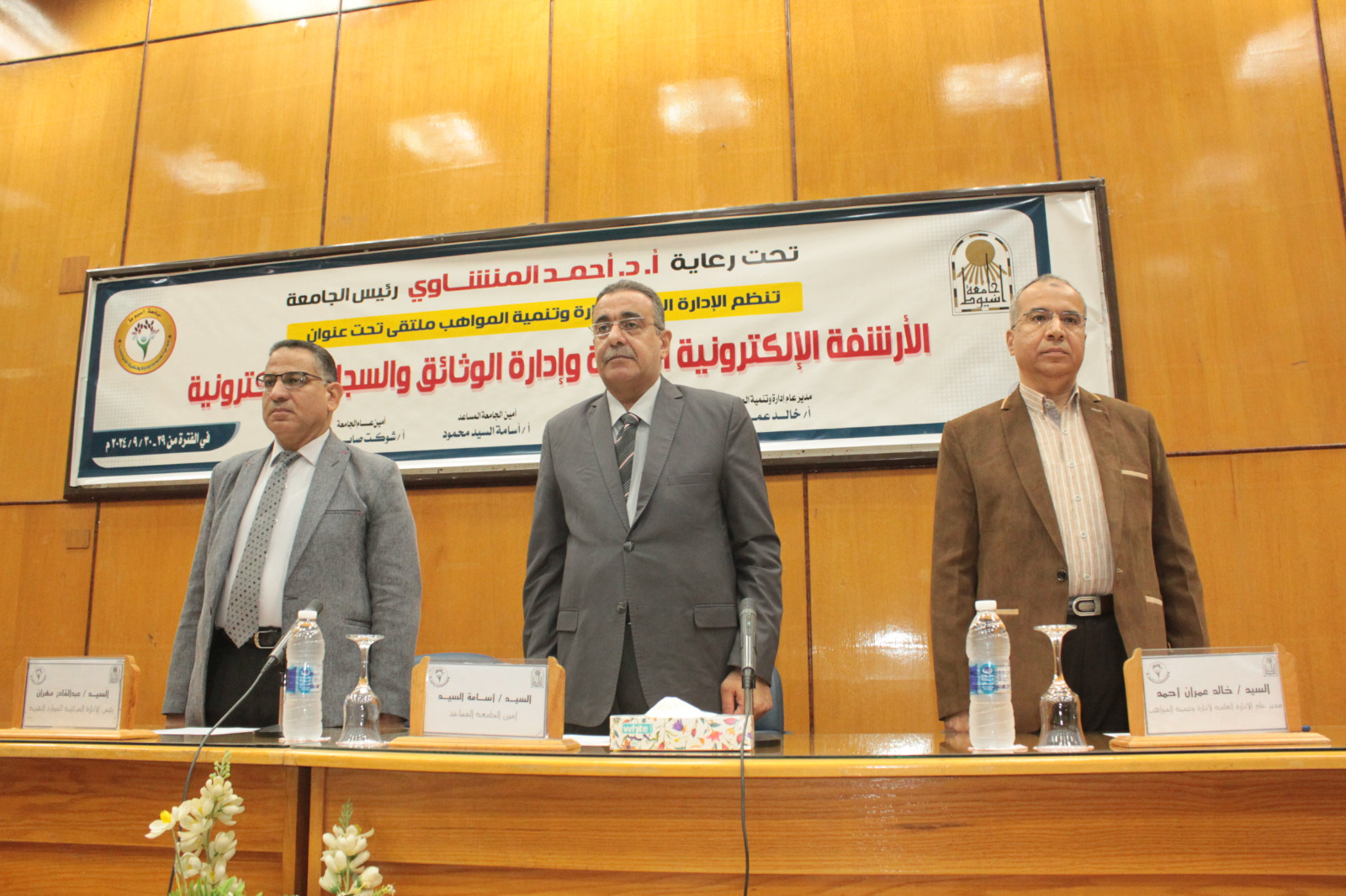 نظمت الإدارة العامة لإدارة وتنمية المواهب، تحت رعاية الدكتور أحمد المنشاوي رئيس جامعة أسيوط؛؟فعاليات لقاء تنموي بعنوان: "الأرشفة الإلكترونية الذكية، وإدارة الوثائق، والسجلات الإلكترونية"، والذي تمتد فعالياته خلال يومي ٢٩، ٣٠ من سبتمبر، وذلك بقاعة المناقشات بمركز المؤتمرات بالمبنى الإداري بالجامعة.