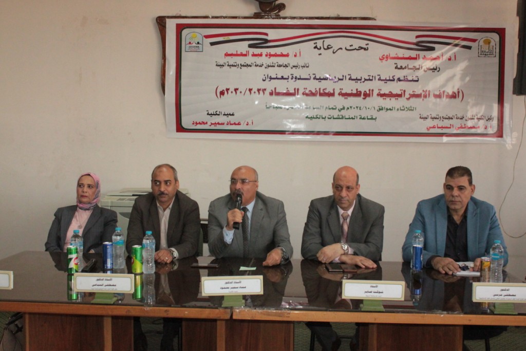 تحت رعاية الدكتور أحمد المنشاوي رئيس جامعة أسيوط؛ استضافت كلية التربية الرياضية، اليوم الثلاثاء الموافق 1 من أكتوبر، الندوة التوعوية، والتثقيفية " أهداف الاستراتيجية الوطنية لمكافحة الفساد 2023 / 2030"، والتى نظمتها الإدارة العامة لنظم المعلومات، والتحول الرقمي، بالتعاون مع الإدارة العامة لإدارة وتنمية المواهب؛ ضمن سلسلة الندوات التي أطلقتها جامعة أسيوط؛ للتعريف بالاستراتيجية الوطنية لمكافحة الفساد.
