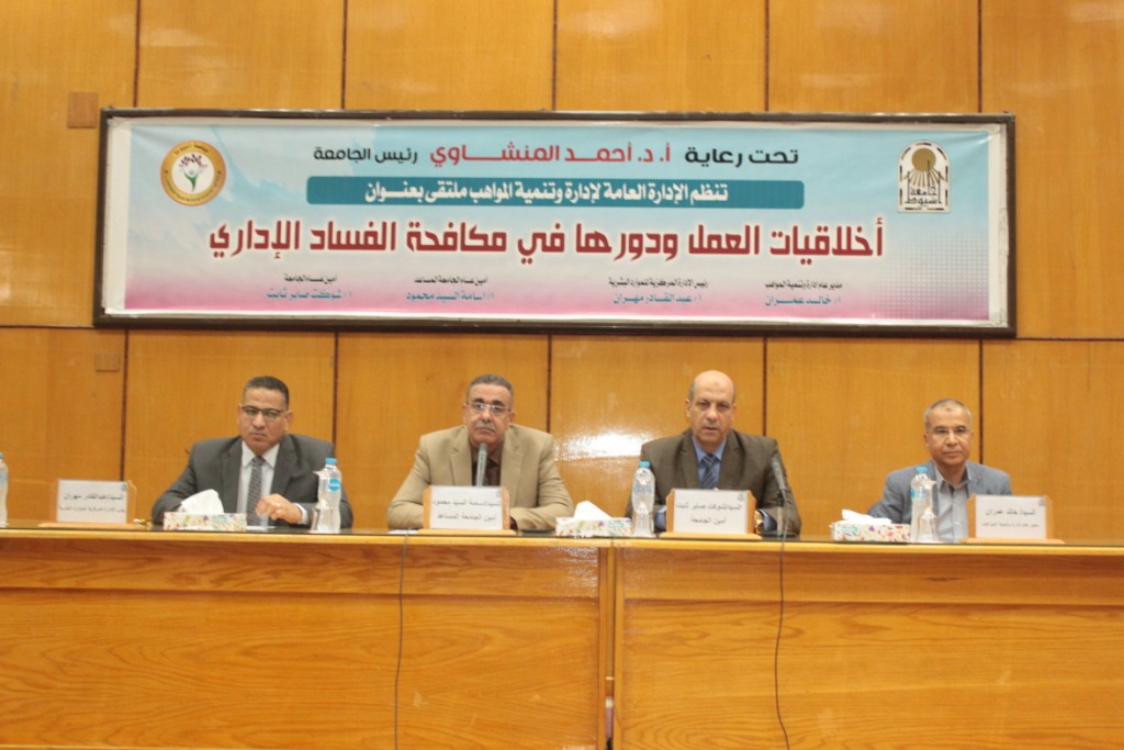 نظمت الإدارة العامة لإدارة وتنمية المواهب، تحت رعاية الدكتور أحمد المنشاوي رئيس جامعة أسيوط، صباح اليوم الأحد الموافق ٢٥ من أغسطس؛ فعاليات ملتقى بعنوان: "أخلاقيات العمل، ودورها في مكافحة الفساد الإداري"، والذي يمتد فعالياته خلال يوميّ ٢٥، ٢٦ من شهر أغسطس، وذلك بقاعة المناقشات، بمركز المؤتمرات، بالمبنى الإداري بالجامعة.