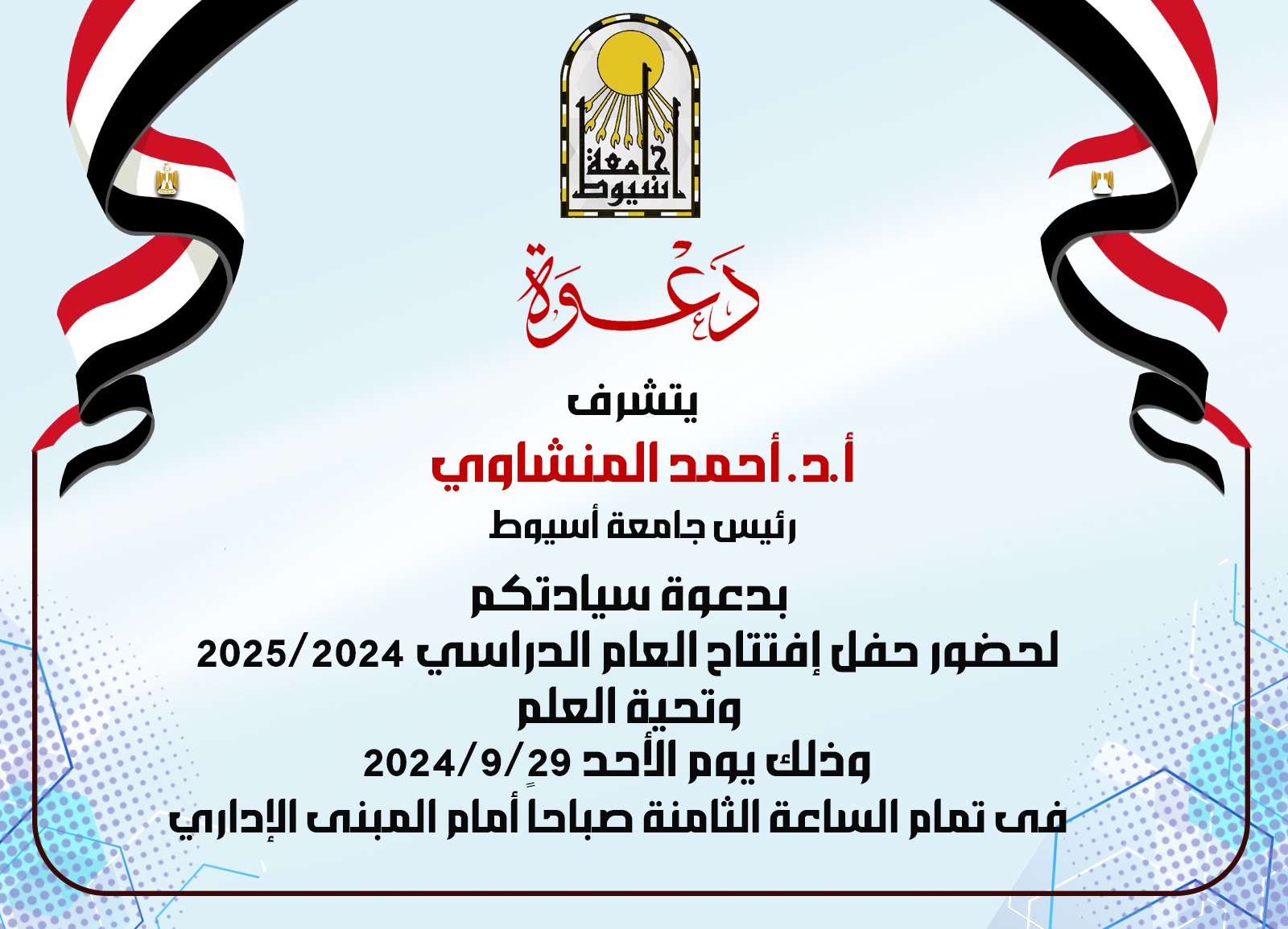 تنظم جامعة أسيوط، حفل افتتاح العام الدراسي 2024/ 2025، وتحية العلم، تحت رعاية الدكتور المنشاوى رئيس الجامعة؛ وإشراف: الدكتور أحمد عبد المولى نائب رئيس الجامعة لشئون التعليم والطلاب، وذلك يوم الأحد المقبل 29 سبتمبر، في تمام الساعة الثامنة صباحًا، أمام المبنى الإداري، والذى يعد تقليداً سنوياً  تنظمه الجامعة، بالتعاون مع أسرة طلاب من أجل مصر، واتحاد طلاب الجامعة، وإدارة الجوالة بالإدارة العامة لرعاية الشباب، وذلك؛ لتعزيز روح الولاء، والانتماء، والمواطنة بين طلاب وطالبات جامعة أسيوط؛ وذلك بتنظيم: الدكتورة مديحة درويش عميد كلية الطب البيطري، والمُشرف العام على الأنشطة الطلابية بالجامعة، والدكتور هيثم إبراهيم مدير عام الإدارة العامة لرعاية الطلاب، ومديري الإدارات بالإدارة العامة لرعاية الطلاب.