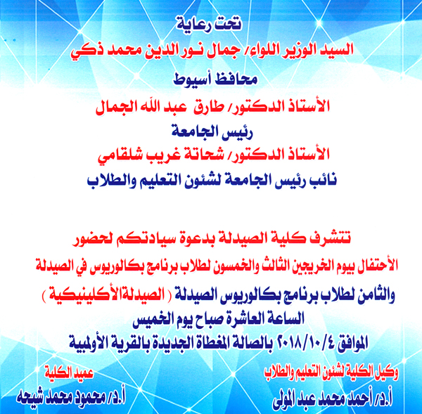 الاحتفال بيوم الخريجين الثالث والخمسون لطلاب برنامج بكالوريوس في الصيدلة ، والثامن لطلاب برنامج بكالوريوس في الصيدلة (صيدلة إكلينيكية) يوم الخميس الموافق 4-10-2018م.