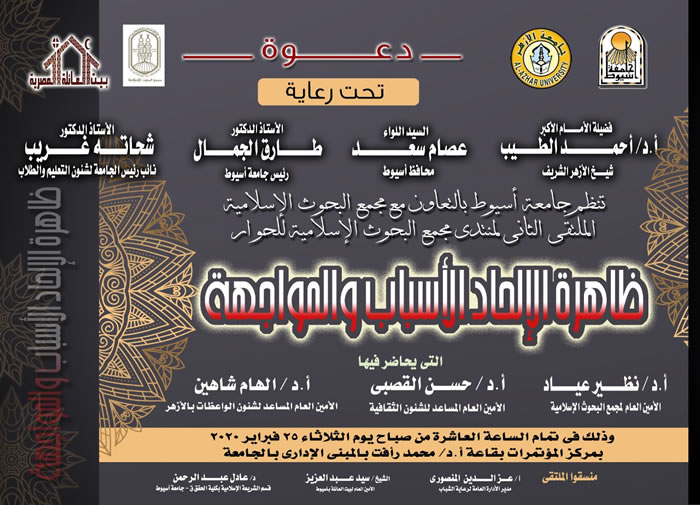 كشف الدكتور طارق الجمال رئيس جامعة أسيوط عن اكتمال الاستعدادات الجارية لإطلاق وقائع الملتقى الثاني لمنتدى مجمع البحوث الإسلامية للحوار غداً الثلاثاء 25 فبراير الجاري والذي تنظمه الجامعة بالتعاون مع المجمع تحت عنوان " ظاهرة الإلحاد الأسباب والمواجهة " وذلك تحت رعاية فضيلة الإمام الأكبر الدكتور أحمد الطيب شيخ الأزهر الشريف ، واللواء عصام سعد محافظ أسيوط .