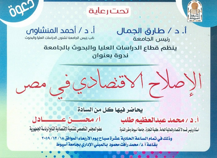 أعلن الدكتور طارق الجمال رئيس جامعة أسيوط عن عقد الجامعة لندوة موسعة الأسبوع المقبل الساعة الحادية عشر من صباح يوم الأربعاء 18 ديسمبر الجاري بقاعة الدكتور محمد رأفت الكبرى للمؤتمرات وذلك بعنوان "الإصلاح الإقتصادى في مصر " والتي ينظمها قطاع الدراسات العليا والبحوث بالجامعة .