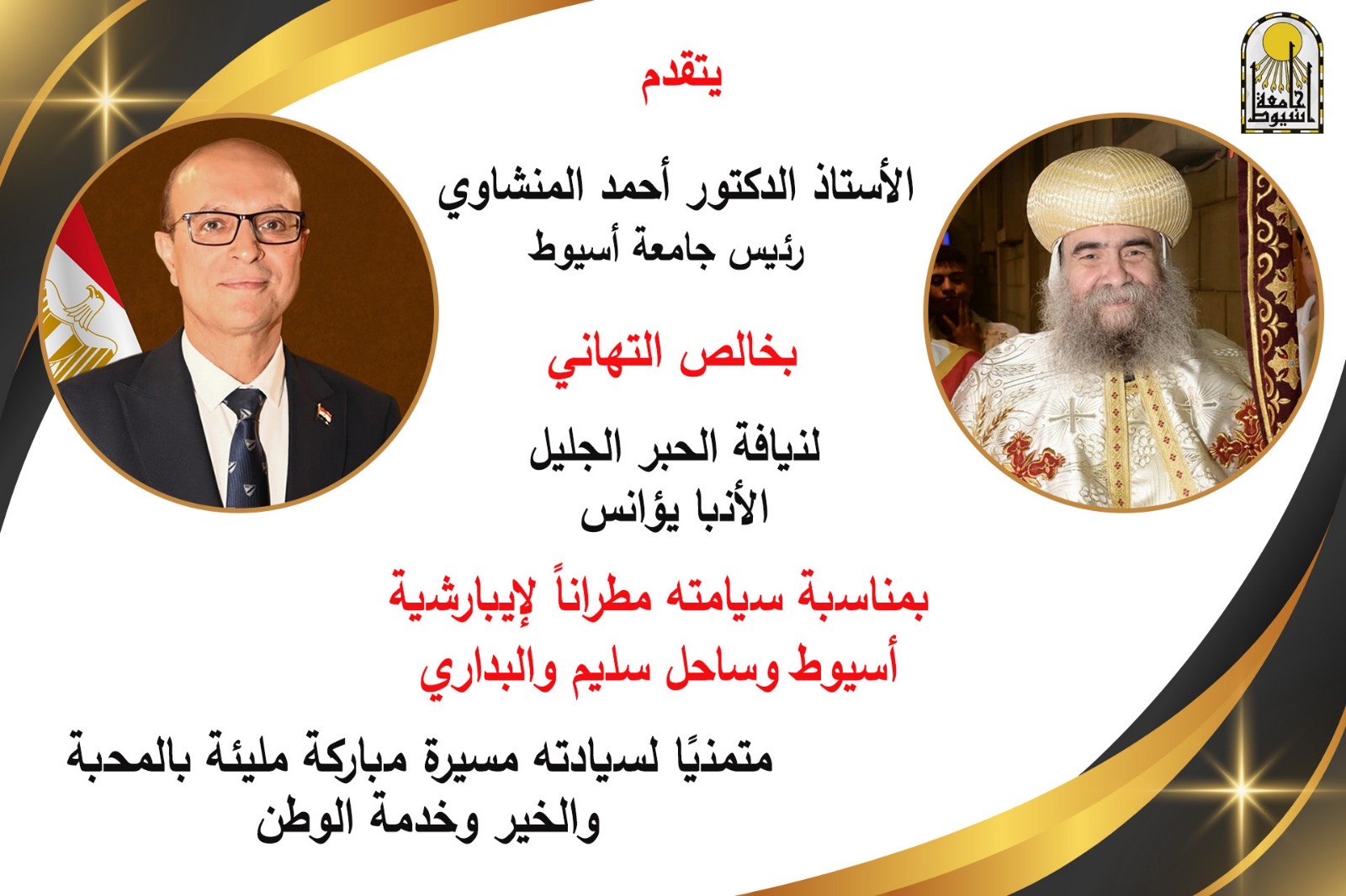 تقدم الدكتور أحمد المنشاوي، رئيس جامعة أسيوط، بخالص التهاني لنيافة الحبر الجليل الأنبا يؤانس بمناسبة سيامته مطرانًا لإيبارشية أسيوط وساحل سليم والبداري، متمنيًا له مسيرة رعوية مباركة مليئة بالمحبة والخير، ومواصلة جهوده في خدمة وطنه ومجتمعه.
