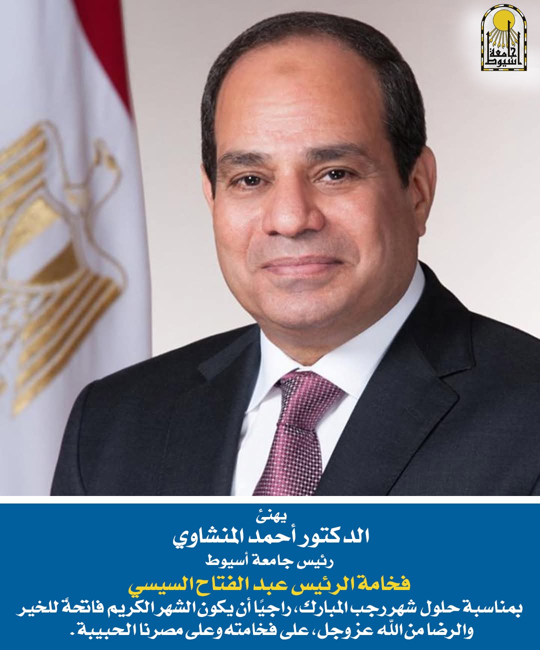 الدكتور المنشاوي رئيس جامعة أسيوط يهنئ فخامة الرئيس السيسي بحلول شهر رجب