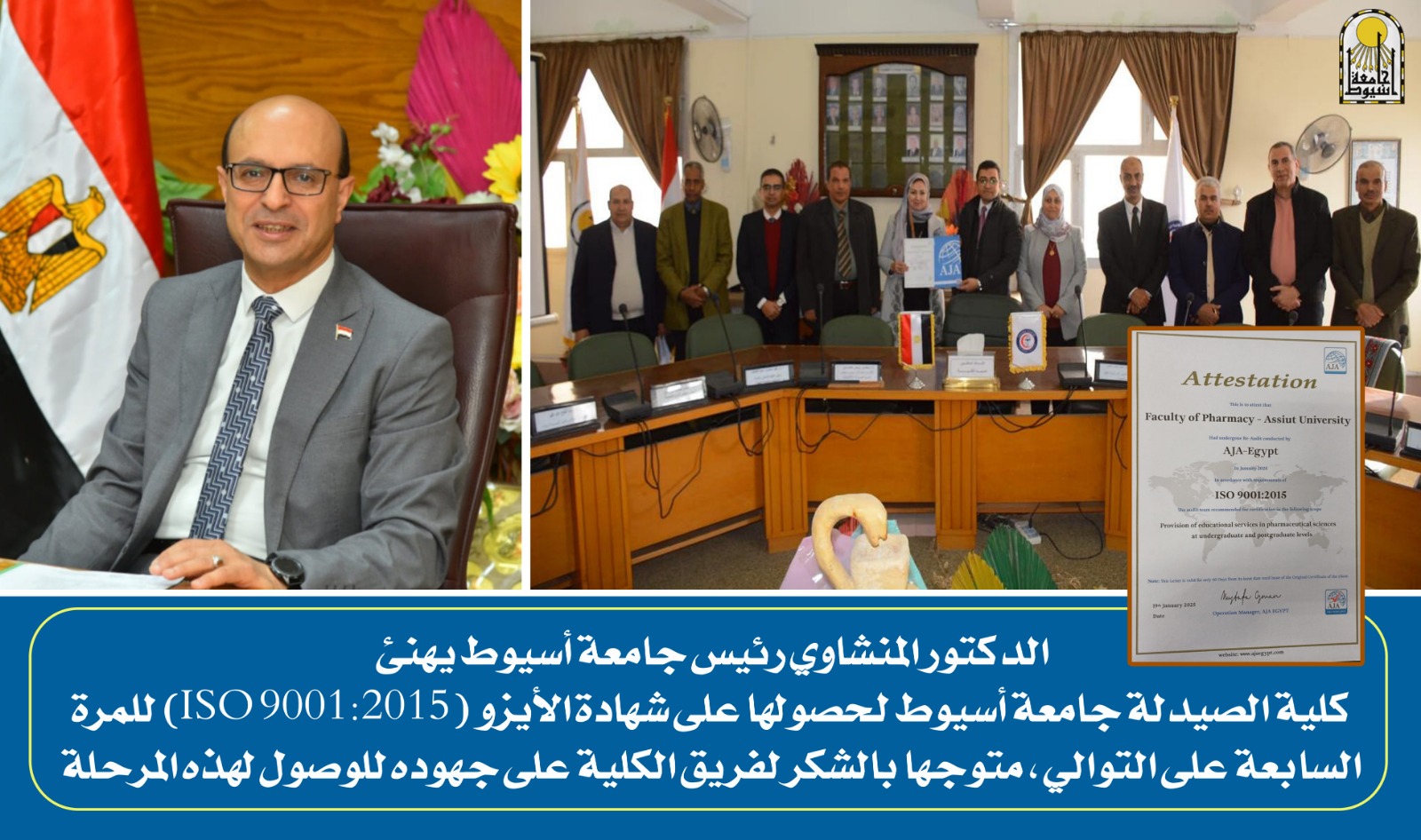 الدكتور المنشاوي رئيس جامعة أسيوط يهنئ كلية الصيدلة جامعة أسيوط لحصولها على شهادة الأيزو (9001:2015 ISO) للمرة السابعة على التوالي، متوجها بالشكر لفريق الكلية على جهوده للوصول لهذه المرحلة.
