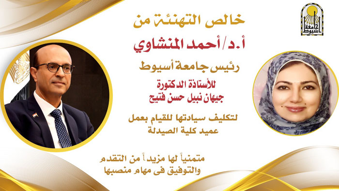 أصدر الدكتور أحمد المنشاوي رئيس جامعة أسيوط؛ قراراً؛ بتكليف الدكتورة جيهان نبيل حسن فتيح الأستاذ بقسم الصيدلانيات بكلية الصيدلة، ووكيل الكلية لشئون الدراسات العليا والبحوث؛ للقيام بعمل عميد لكلية الصيدلة.