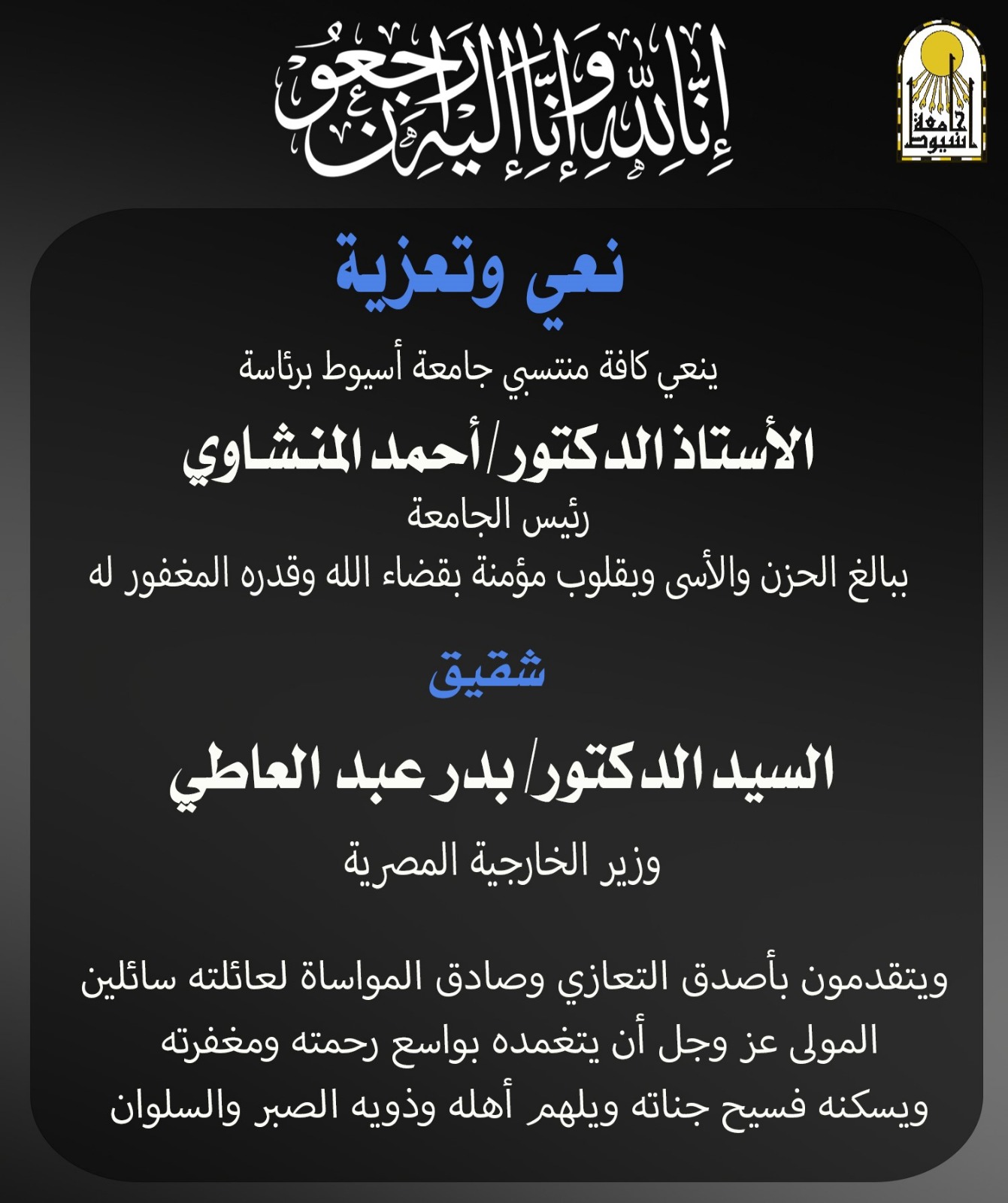 حرص الدكتور أحمد المنشاوي رئيس جامعة أسيوط؛ أن يستقبل الدكتور بدر عبد العاطي وزير الخارجية؛ ليكون من أوائل المعزين لسيادته في وفاة شقيقه، فيما أصطف معه الدكتور أحمد عبد المولى نائبه لشئون التعليم والطلاب، والدكتور محمود عبدالعليم نائبه لشئون خدمة المجتمع وتنمية البيئة، والدكتور جمال بدر نائبه لشئون الدراسات العليا والبحوث؛ والدكتور دويب صابر عميد كلية الحقوق والمستشار القانوني لرئيس الجامعة، والأستاذ شوكت صابر أمين عام الجامعة.