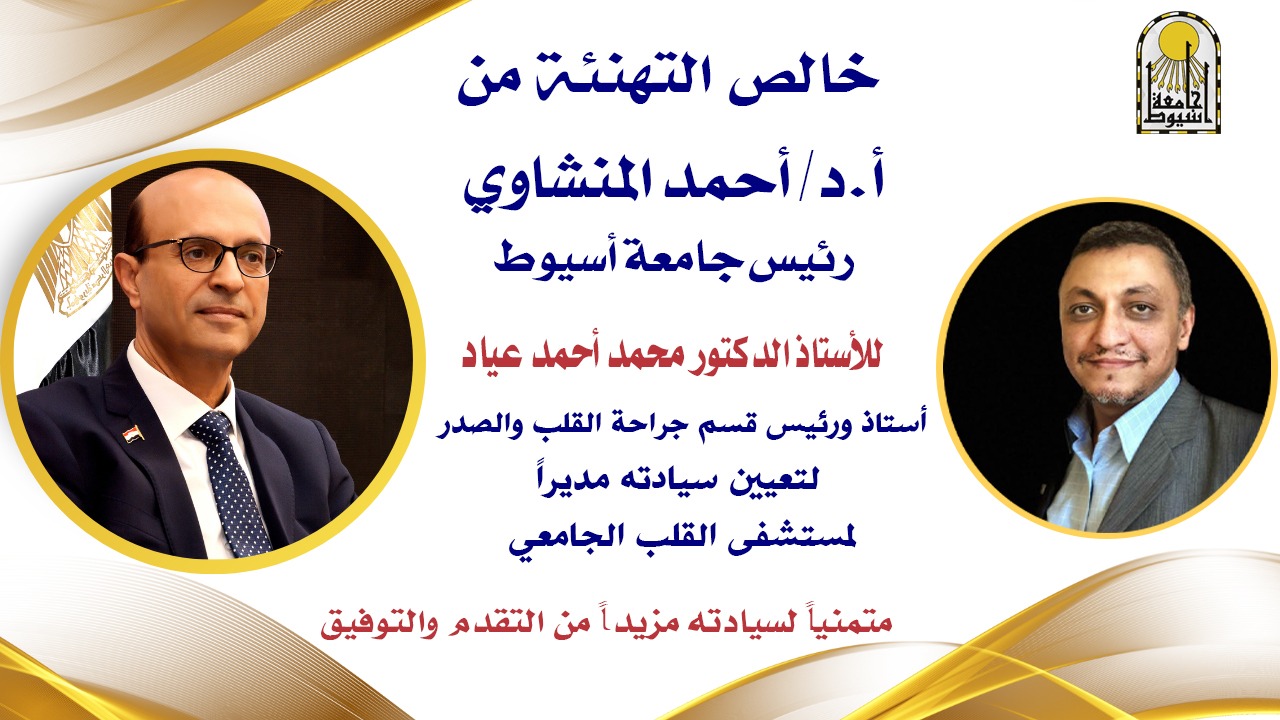 هنأ الدكتور أحمد المنشاوي رئيس جامعة أسيوط؛ الدكتور محمد أحمد عياد أستاذ ورئيس قسم جراحة القلب والصدر بكلية الطب؛ بمناسبة تعيينه مديرًا لمستشفى القلب الجامعي، متمنياً له المزيد من التوفيق والنجاح في تطوير مستشفى القلب الجامعي، والنهوض به في إطار الخطة الاستراتيجية للجامعة والوزارة.