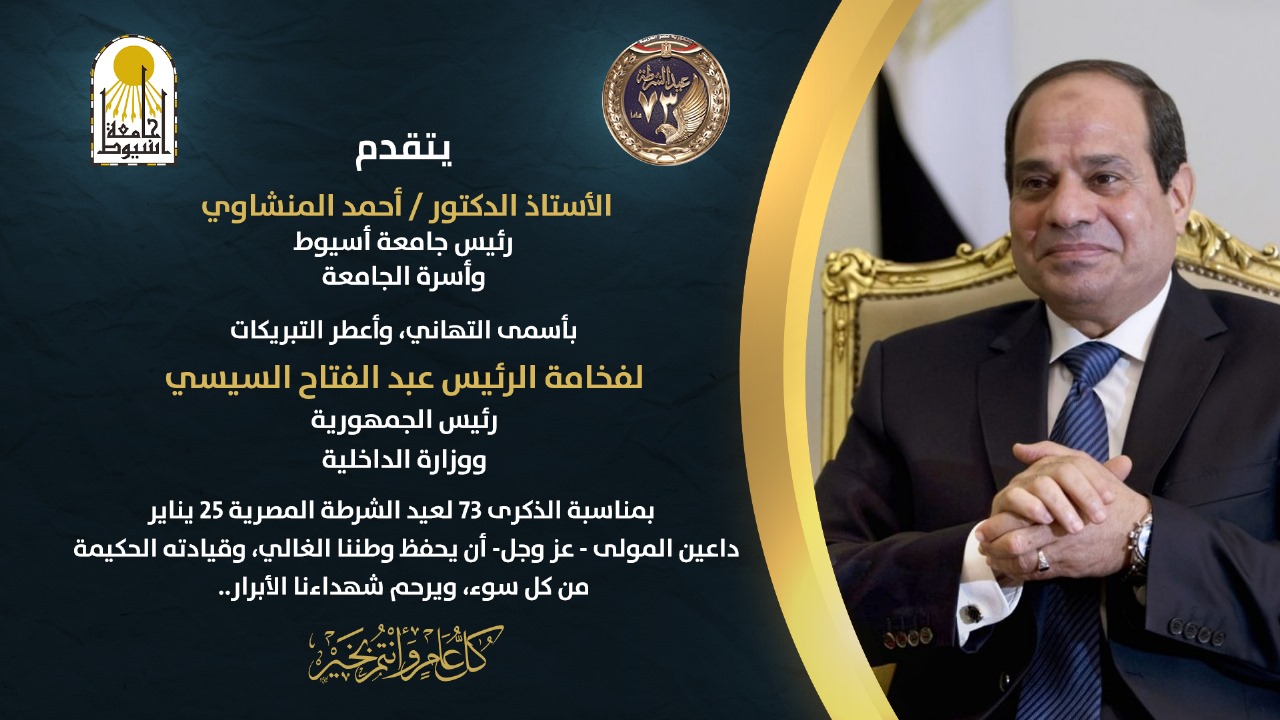 هنأ الدكتور أحمد المنشاوي رئيس جامعة أسيوط، فخامة الرئيس عبد الفتاح السيسي، واللواء محمود توفيق وزير الداخلية، وضباط وجنود ورجال الشرطة البواسل؛ بمناسبة عيد الشرطة الباسلة الـ73، الموافق 25 من يناير من كل عام.