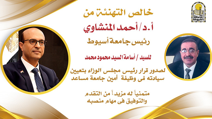 هنأ الدكتور أحمد المنشاوي رئيس جامعة أسيوط، الأستاذ أسامه السيد محمود محمد بمناسبة صدور قرار رئيس مجلس الوزراء بتعينه في وظيفة أمين جامعة مساعد بالمستوى الوظيفي ( العالية) بجامعة أسيوط، لمدة عام.