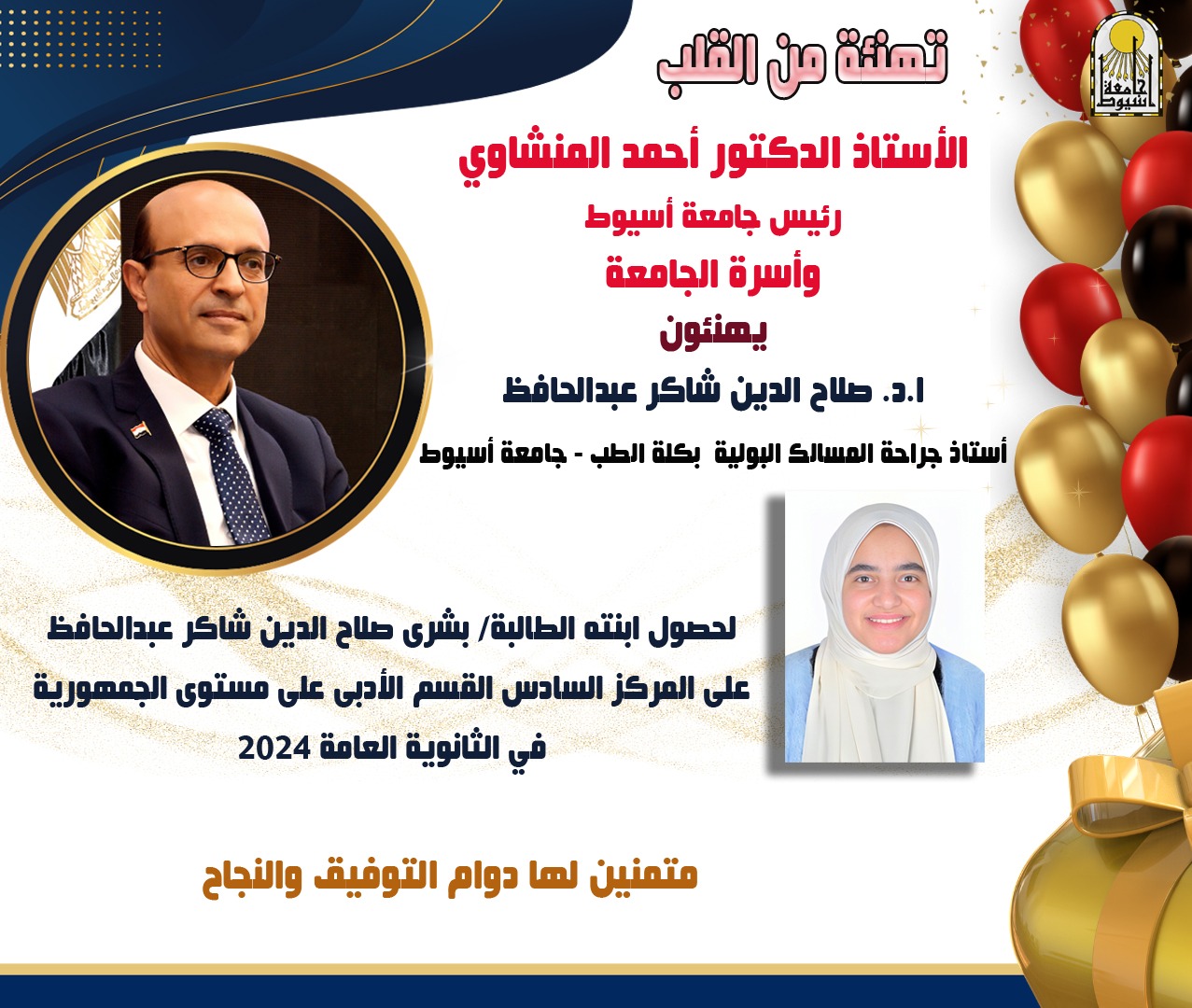 يهنئ الدكتور أحمد المنشاوي رئيس جامعة أسيوط، الطالبة بشرى صلاح الدين شاكر عبدالحافظ، الحاصلة على المركز السادس مكرر في الشعبة الأدبية في الثانوية العامة 2024، متمنيًا لها دوام التوفيق والنجاح.