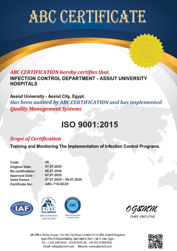 الدكتور المنشاوي يعلن حصول إدارة مكافحة العدوى بجامعة أسيوط على اعتماد الجودة الدولي ISO 9001:2015