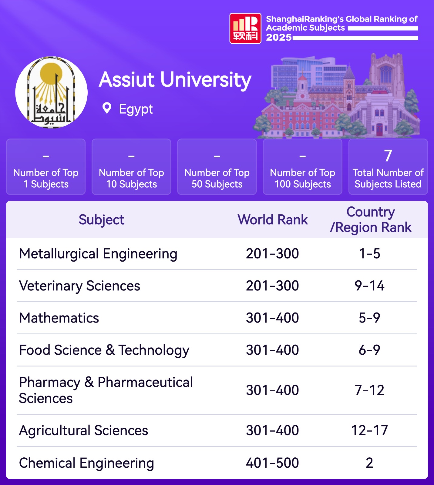 وأوضح التقرير الصادر حول التصنيف أن جامعة أسيوط جاءت ضمن الفئة من 200–300 عالميًا في كل من هندسة التعدين والعلوم البيطرية، كما حققت الفئة من 300–400 عالميًا في تخصصات علوم الرياضيات، وعلوم وتكنولوجيا الغذاء، والعلوم الصيدلانية، والعلوم الزراعية. كما جاءت الجامعة ضمن الفئة 400–500 عالميًا في تخصص الهندسة الكيميائية.