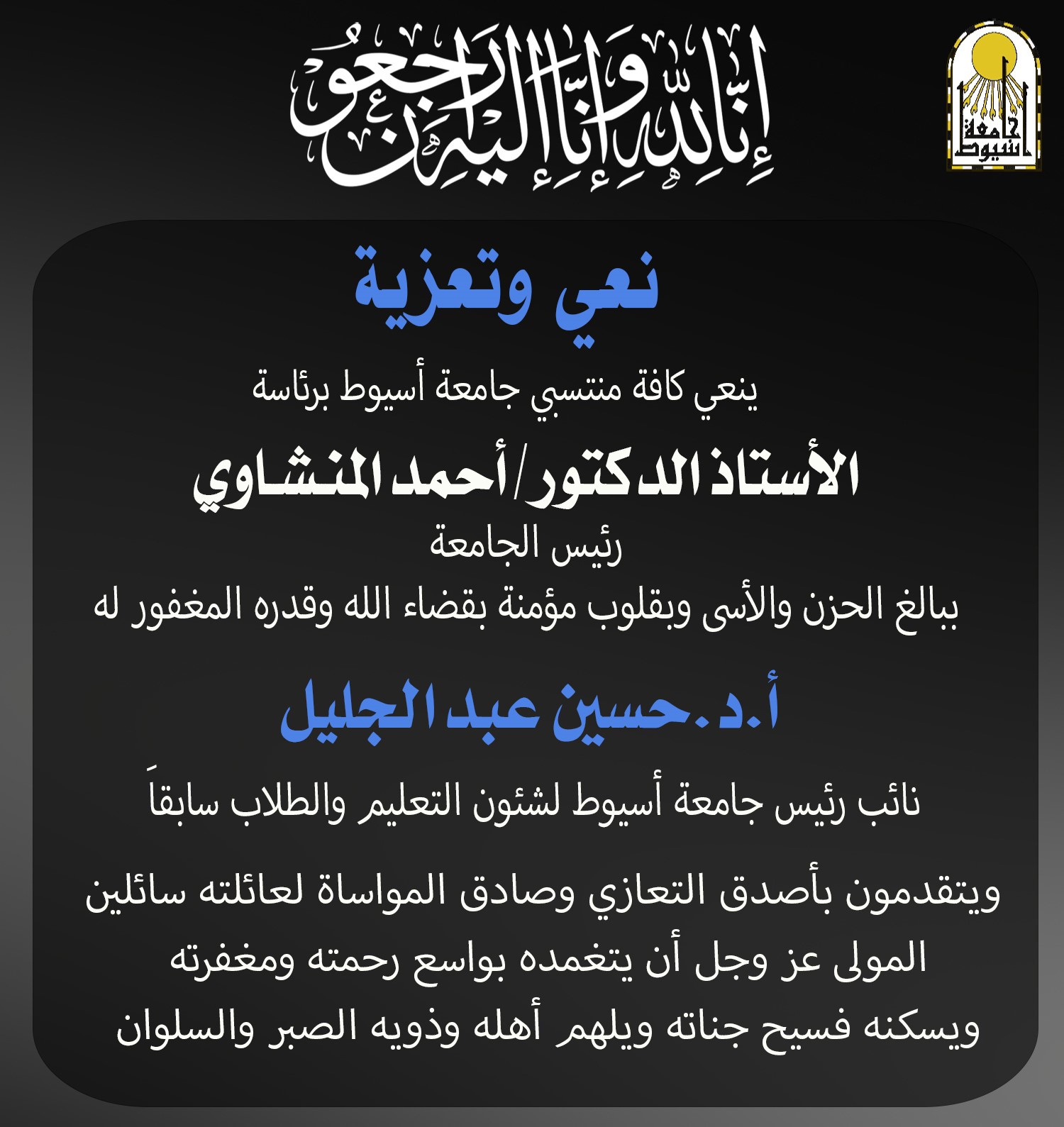 ينعي الدكتور أحمد المنشاوي رئيس جامعة أسيوط؛ بخالص الحزن والأسى الدكتور حسين عبدالجليل أحمد حسن الأستاذ المتفرغ بقسم الألبان بكلية الزراعة ونائب رئيس الجامعة لشئون التعليم والطلاب سابقاً، الذي وافته المنية مساء اليوم.