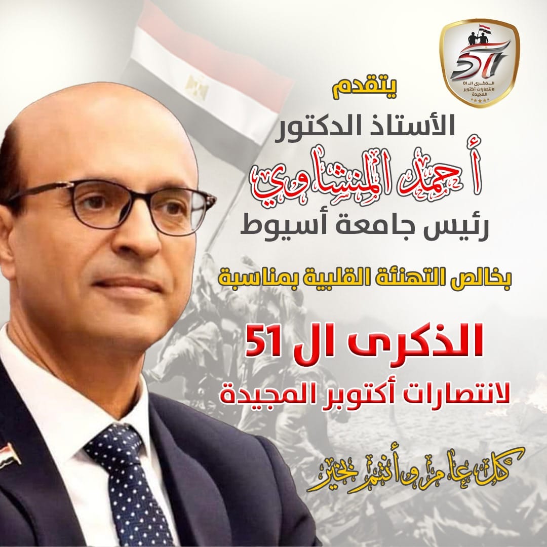 حرص الأستاذ الدكتور أحمد المنشاوي رئيس جامعة أسيوط، على تقديم التهنئة بمناسبة الذكرى الحادية والخمسين لنصر أكتوبر المجيد، عبر صفحته الرسمية على الفيس بوك، " كل عام وانتم بخير، بمناسبة ذكرى نصر أكتوبر المجيد، الذي يمثل علامة مضيئة في تاريخنا الوطني، وجسد فيه أبطال الجيش المصري معجزة عسكرية لاسترداد الأرض والكرامة الوطنية".