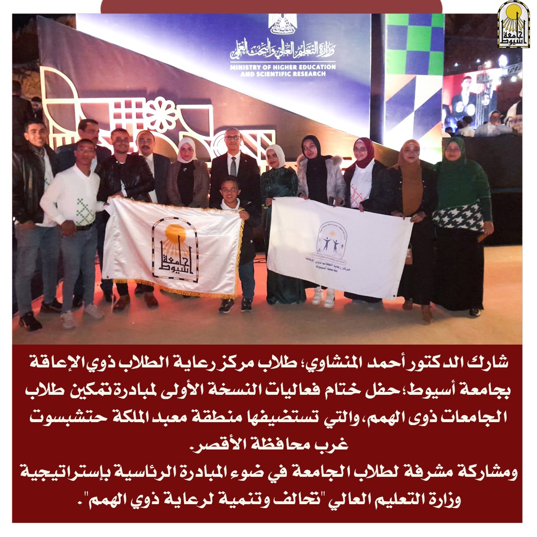 الدكتور المنشاوي يشارك طلاب مركز رعاية الطلاب ذوي الإعاقة بجامعة أسيوط حفل ختام فعاليات النسخة الأولى لمبادرة تمكين طلاب الجامعات ذوى الهمم، بحضور وزير التعليم العالي والبحث العلمي الدكتور محمد أيمن عاشور، والتي تستضيفها منطقة معبد الملكة حتشبسوت غرب محافظة الأقصر.