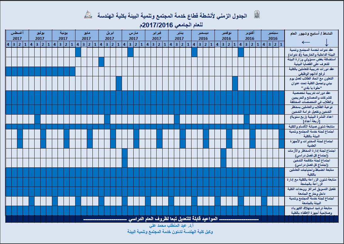 الجدول الزمن لأنشطة قطاع خدمة المجتمع وتنمية البيئة بكلية الهندسة للعام الجامعى 2016/2017 5 سبتمبر 2016 الجدول الزمن لأنشطة قطاع خدمة المجتمع وتنمية البيئة بكلية الهندسة للعام الجامعى 2016/2017