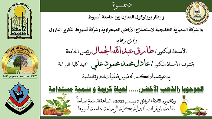 يشهد الدكتور طارق الجمال رئيس جامعة أسيوط غداً الثلاثاء 7 ديسمبر وقائع الندوة العلمية التي تنظمها كلية الزراعة تحت عنوان الجوجوبا (الذهب الأخضر)...لحياة كريمة وتنمية المستدامة وذلك بقاعة المؤتمرات الدولية بكلية الزراعة .
