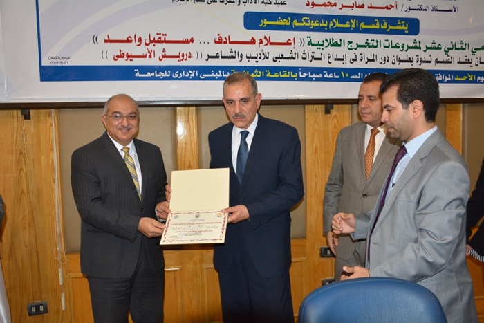 جاء ذلك ضمن أعمال المهرجان الإعلامي الثاني عشر لمشروعات التخرج الطلابية والذي نظمه قسم الإعلام بكلية الآداب بجامعة أسيوط تحت شعار " إعلام هادف ... مستقبل واعد " ، والذي شهد أيضاً تكريم الشاعر والأديب درويش الأسيوطي ، وأعضاء لجنة التقييم والتحكيم للمشاريع ومنهم الدكتورة ماجدة عبد الباقى المدرس بقسم الإعلام ، والأستاذ جمال حمدان مدير عام شبكات الإذاعات الإقليمية ، والأستاذ إسلام رضوان رئيس تحرير جريدة الأسايطة ، والأستاذ وائل سمير مكتب جريدة الأهرام ، والأستاذة نهى علوي مراسل قناة الصعيد.